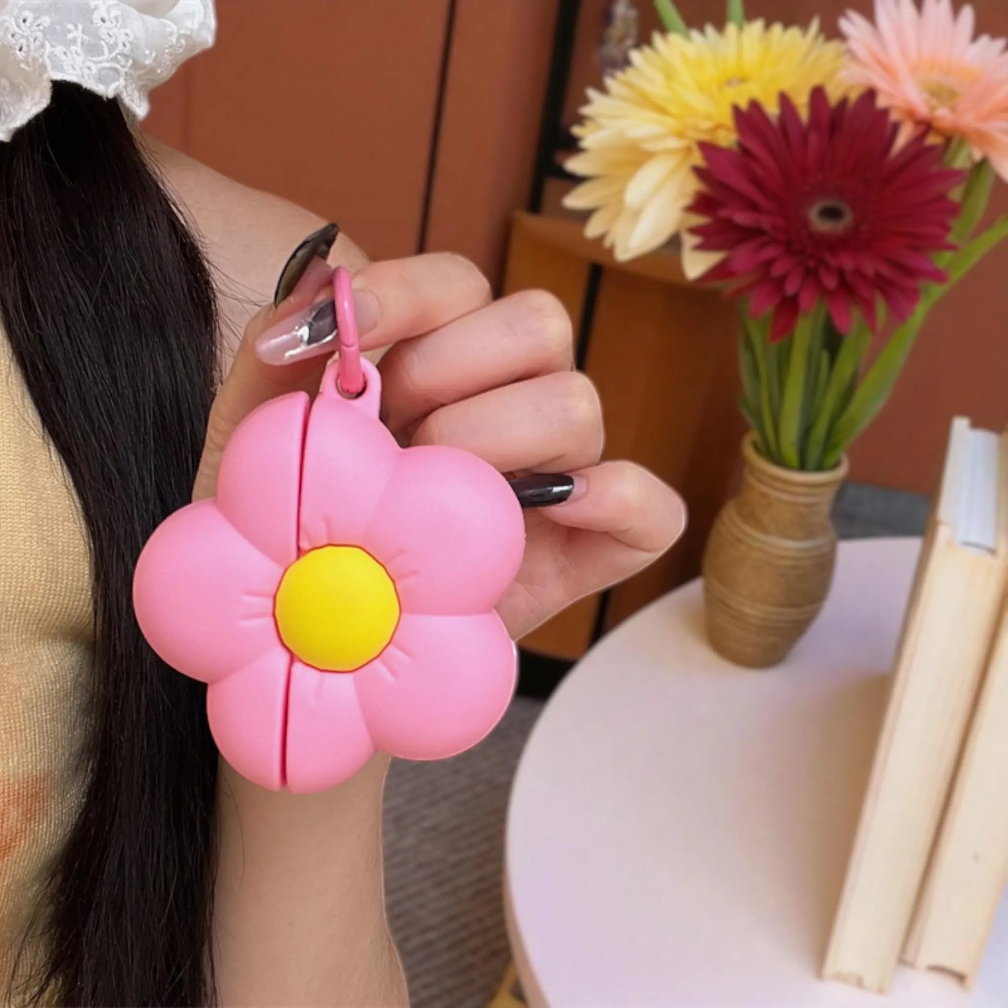 Protector de silicona anti golpes y rayones con diseño de flor. Incluye ganchito.
